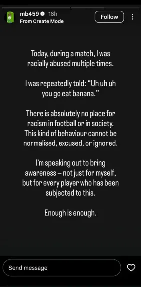 "اليوم خلال المباراة، تعرضتُ لإساءات عنصرية متكررة. قيل لي مرارًا: 'أوه أوه اذهب، كُل موزة'. لا مكان للعنصرية في كرة القدم، ولا في المجتمع. لا يمكن تبرير هذا السلوك أو التغاضي عنه."